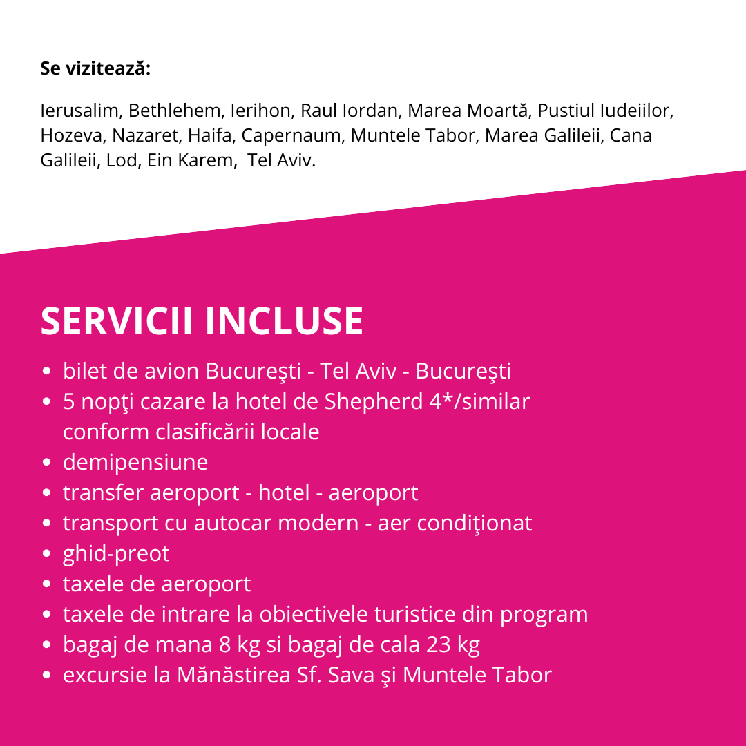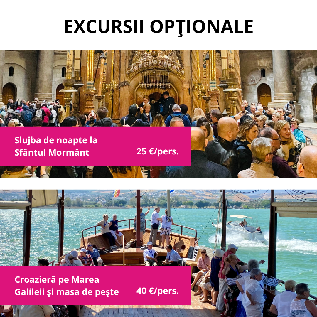 - excursiile optionale din program, Slujba de noapte la Mormantul Sfant, precum si alte excursii propuse la fata locului (grup minim 25 pers)